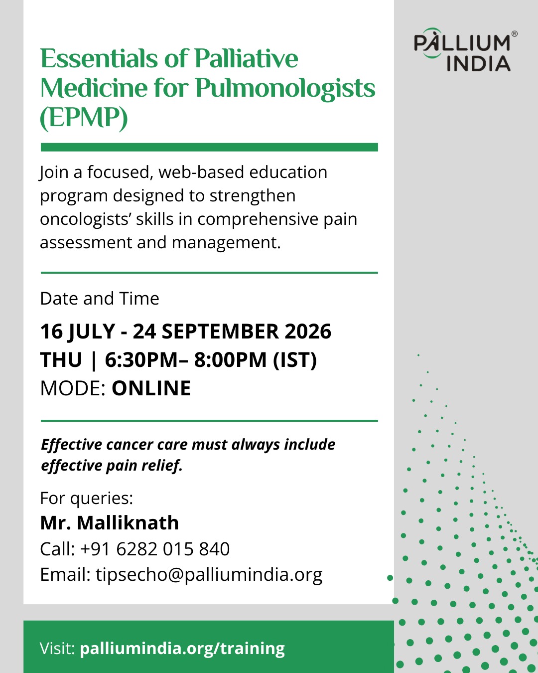 The program Essentials of Palliative Medicine for Pulmonologists –focusses on integrating the principles of palliative care into Pulmonology practice, with special focus on Chronic Lung Diseases.