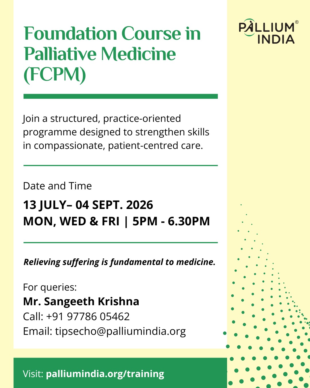 Trivandrum Institute of Palliative Sciences (TIPS), Pallium India collaborates with ECHO International (Extension for Community Healthcare Outcomes) to conduct palliative care certificate courses in India. The aim of these courses is to provide training in pain management and palliative care.
