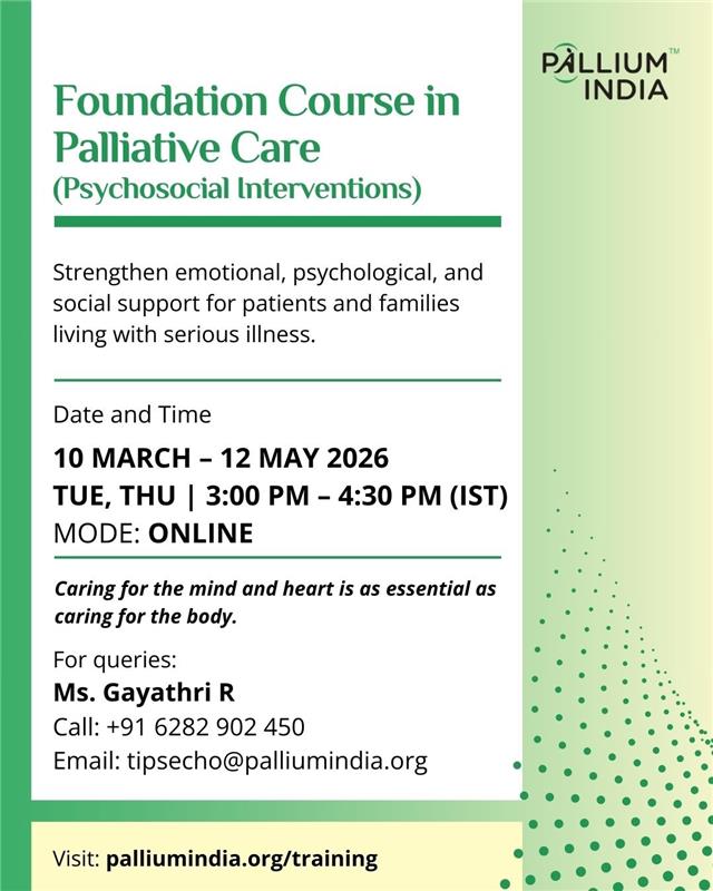 For more information on this course or for any assistance, please call us at +91 90726 20081 or write to us: tipsecho@palliumindia.org