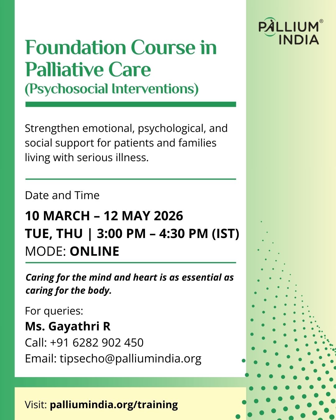 Foundation Course in Palliative Care – Psychosocial Interventions (Basics) is a course aimed at familiarising healthcare providers with the psychosocial aspects of providing care in palliative care settings.