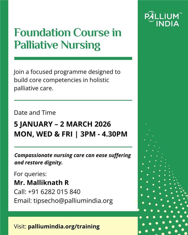 Trivandrum Institute of Palliative Sciences (TIPS), Pallium India collaborates with ECHO International (Extension for Community Healthcare Outcomes) to conduct palliative care certificate courses in India. The aim of these courses is to provide training in pain management and palliative care.