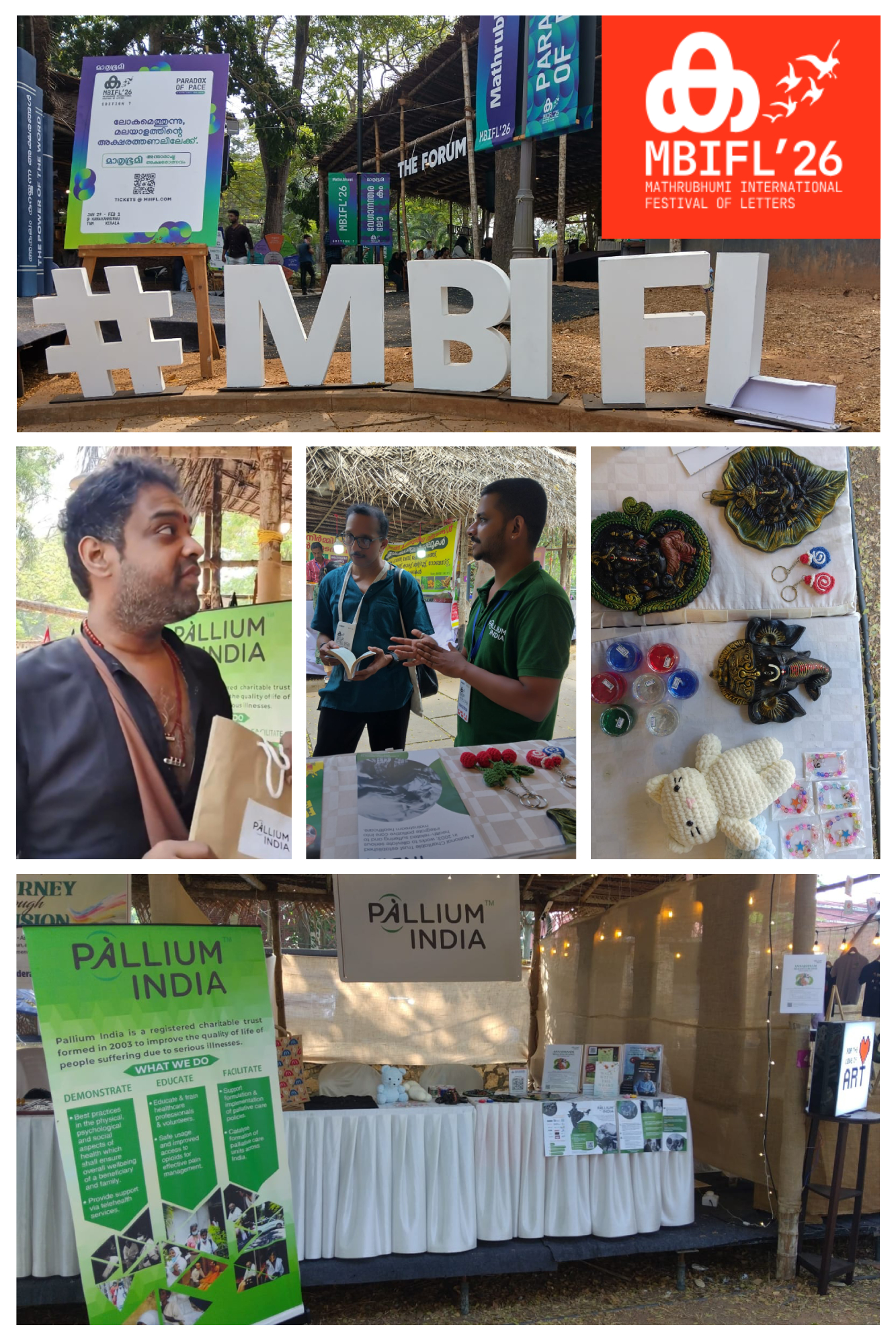Pallium India participated in MBIFL 2026 with a dedicated stall (Stall No. 3), sharing space with a vibrant mix of for-profit and non-profit organisations. The festival offered a meaningful platform to highlight Pallium India’s Rehabilitation pillar, showcasing creative products made by our care recipients—crochet items, scented candles, edibles, jute bags, murals, and more. All proceeds from the sales directly support our patients under rehabilitation care. Dr. Rajagopal’s books were also displayed, drawing interest from literature enthusiasts and visitors alike.