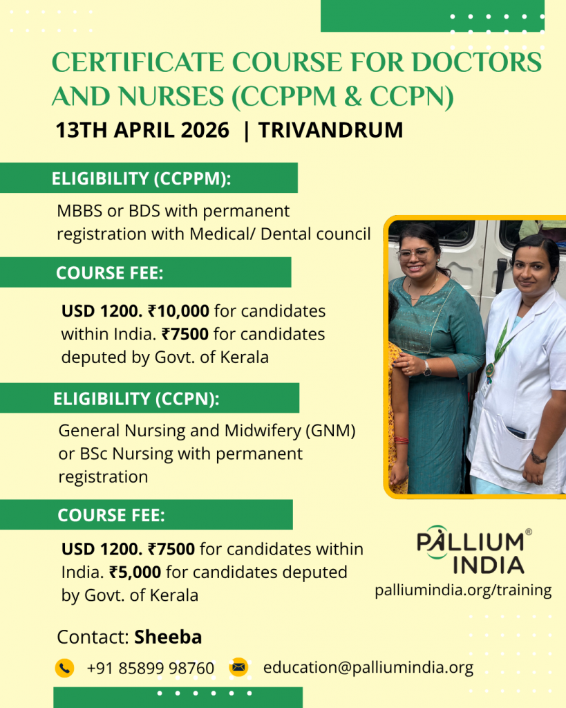 The courses (Certificate Course in Pain and Palliative Medicine – CCPPM & Certificate Course in Palliative Nursing – CCPN) will be held in the institutions and palliative care services attached to Trivandrum Institute of Palliative Sciences (TIPS), Pallium India, including outpatient clinic, at the home care services and inpatient unit.